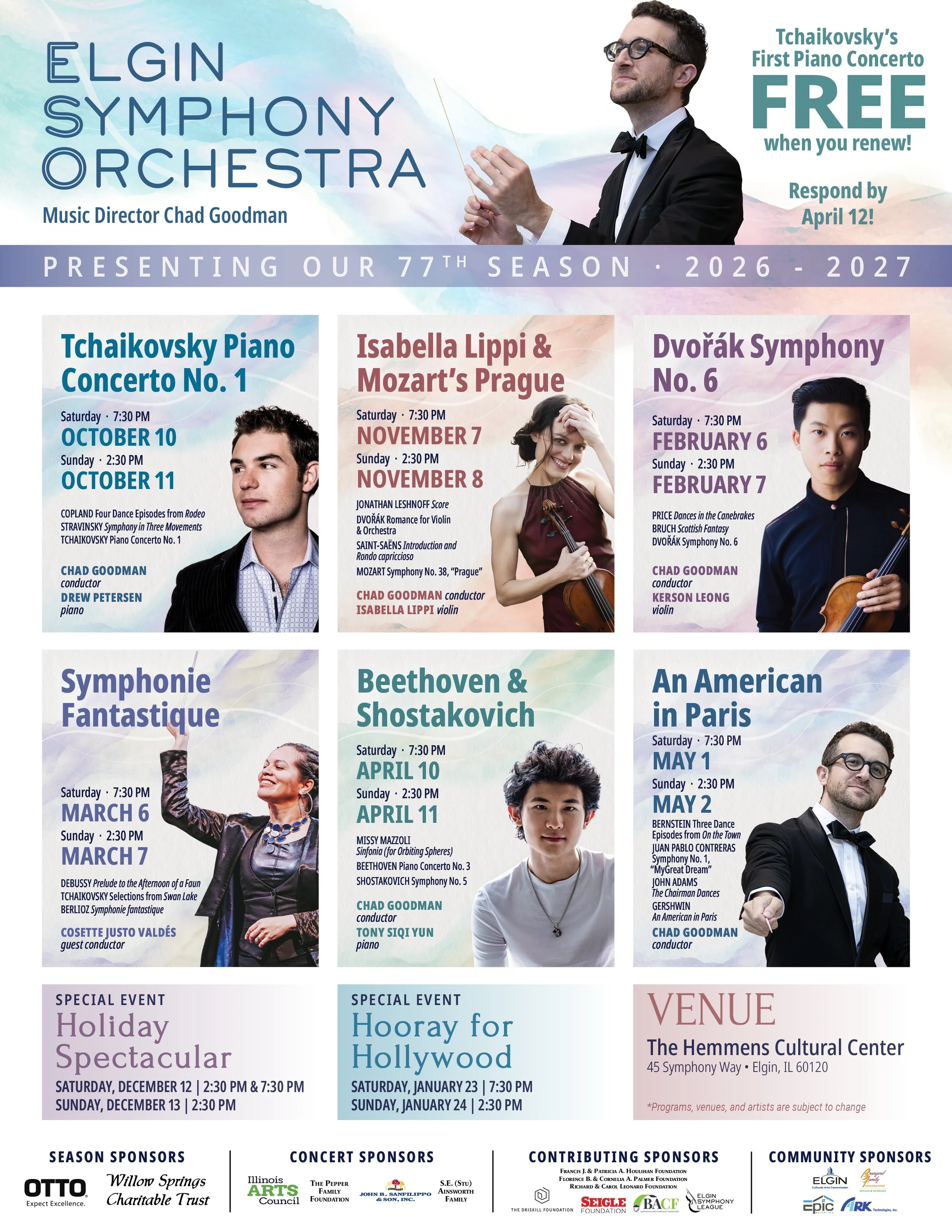La emocionante asociación entre el Director Musical Chad Goodman y la ESO continúa atrayendo audiencias entusiastas al Hemmens Cultural Center, con los conciertos dominicales rutinariamente agotados. Ahora es el momento de reservar su asiento para la próxima temporada, con momentos destacados que incluyen: